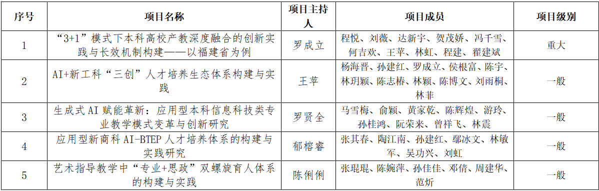 根据《福建省本科高校教育教学研究项目管理办法(试行)》(闽教规〔2022〕4号)、《福建省教育厅办公室关于开展2025年本科高校教育教学研究项目申报工作的通知》(闽教办高〔2025〕1号)、《阳光学院关于开展2025年省级教育教学改革与研究项目申报推荐工作的通知》(教务〔2025〕47号)的要求,教务处组织开展了2025年省级教育教学改革与研究项目申报推荐工作。经教师个人申报、教学单位审核推荐、专家评审,拟推荐5个项目,现就名单予以公示。