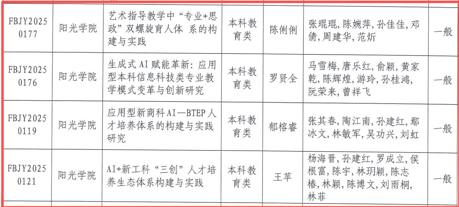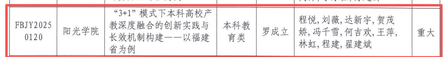 根据《福建省教育厅关于公布2025年本科高校教育教学研究项目立项名单的通知》闽教高〔2025〕24号,经高校推荐、专家评审,我校获批2025年福建省本科高校重大教育教学改革研究项目1项,一般教育教学改革研究项目4项,项目获批数量位居全省民办高校并列第一。